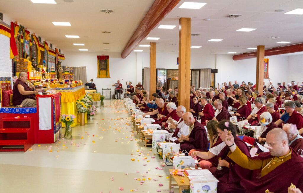 Al haber recibido tales enseñanzas y haberse dedicado a las prácticas con compañeros de la sangha, todos expresaron su inmensa gratitud a nuestro precioso guru que incansablemente logra todo beneficio para todos los seres. La asamblea concluyó el retiro haciendo vastos ofrecimientos de mandala y de cuerpo, palabra y mente.