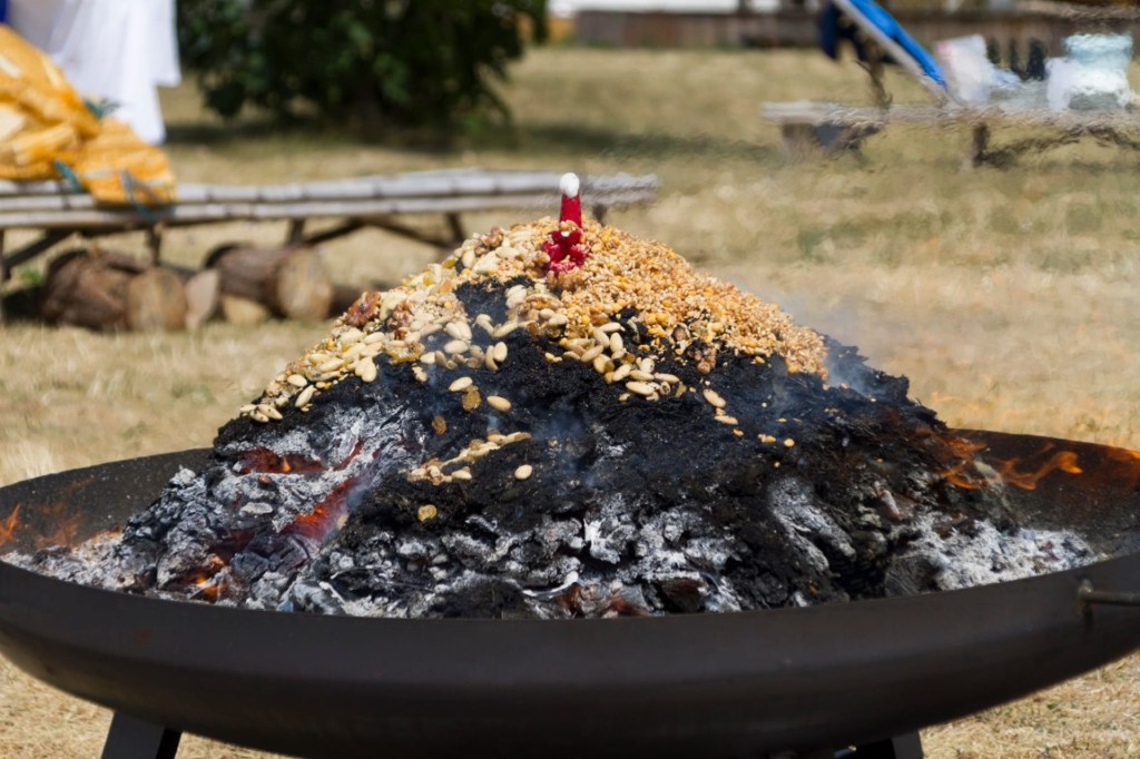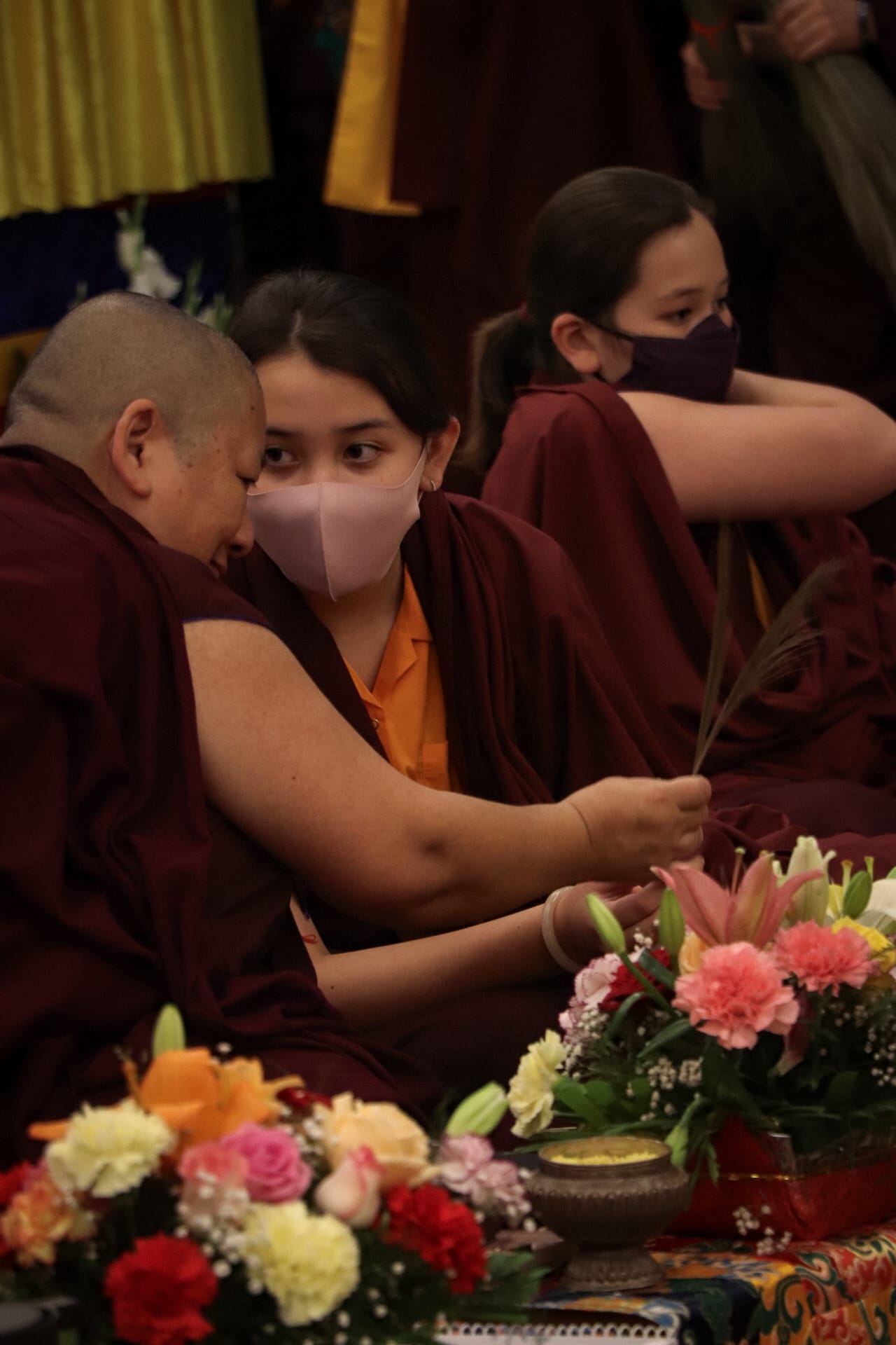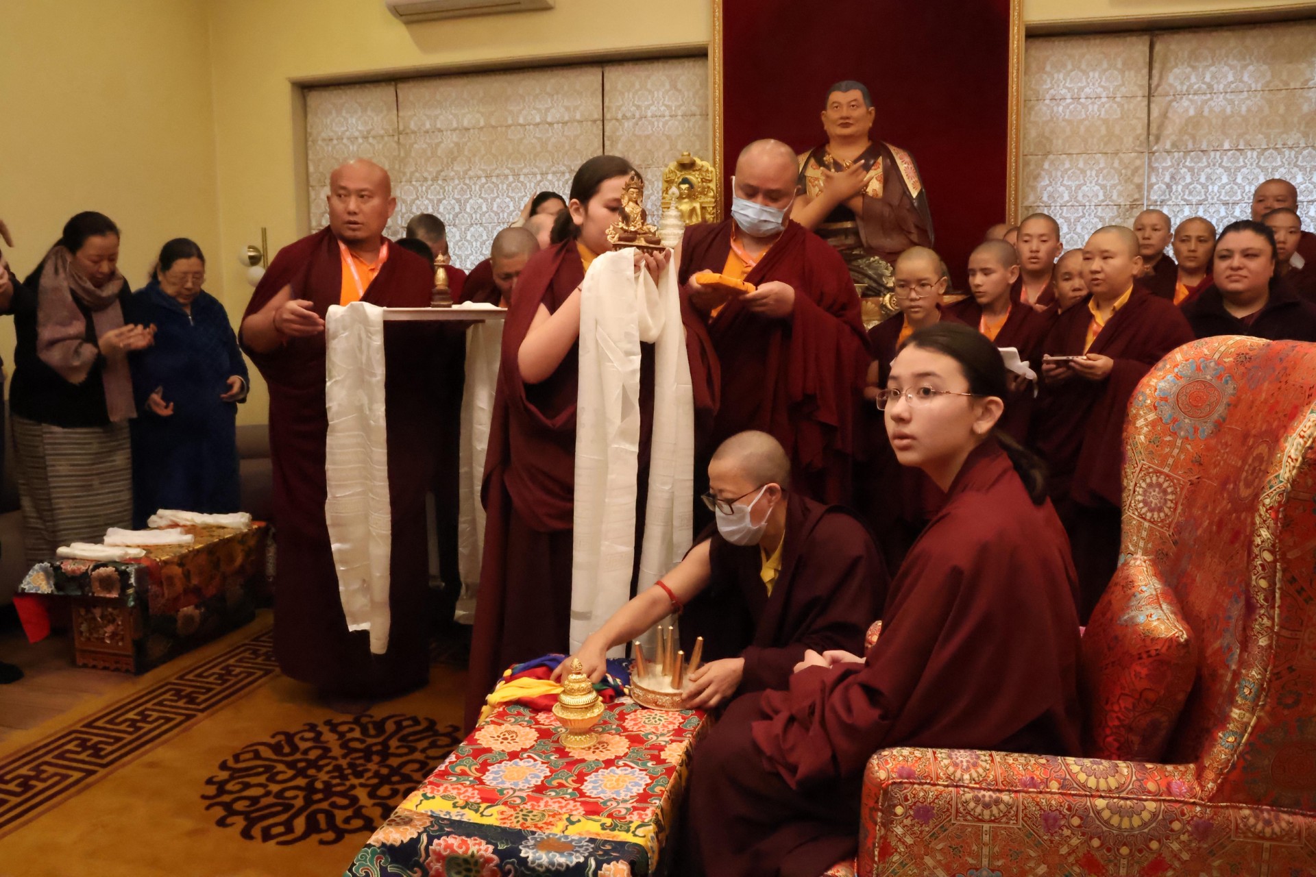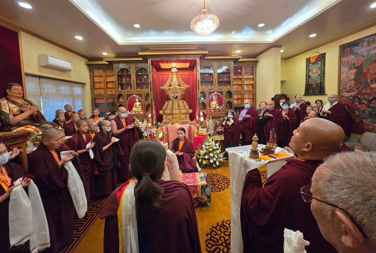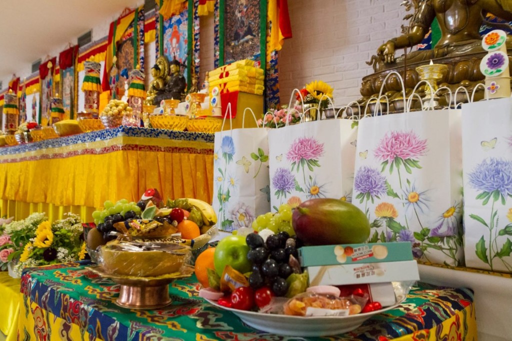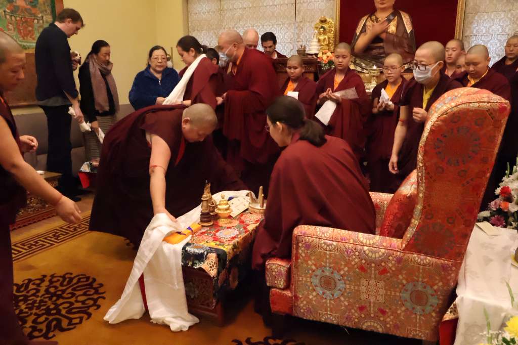 Al concluirse el retiro, Rinpoché guió a la sangha reunida en la práctica de ofrecimiento de tshog a Guru Rinpoché, y la sangha mundial participó a través de la transmisión en vivo desde sus casas en el ofrecimiento de ganachakra. Con un despliegue de vastas ofrendas realizadas en los diferentes altares repartidos por el mundo, la sangha practicó como una sola sangha a los pies del guru.