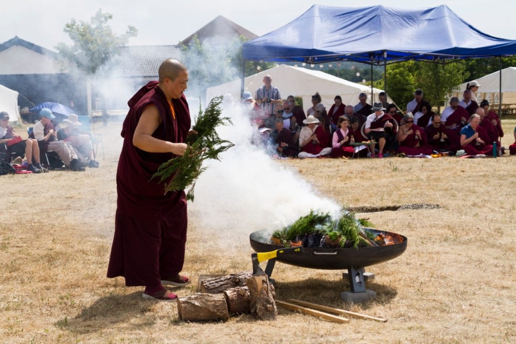 Después, al empezar el retiro, la sangha hizo ofrecimientos de mandala y de ten sum, cuerpo, palabra y mente, y rogó a Rinpoché que gire la Rueda del Dharma. Rinpoché otorgó enseñanzas profundas a la asamblea reunida, que fueron entretejidas con sesiones de práctica en el chö gar, el campamento de dharma. De esta manera, los estudiantes recibieron enseñanzas, e inmediatamente las pusieron en práctica y las llevaron a cabo.