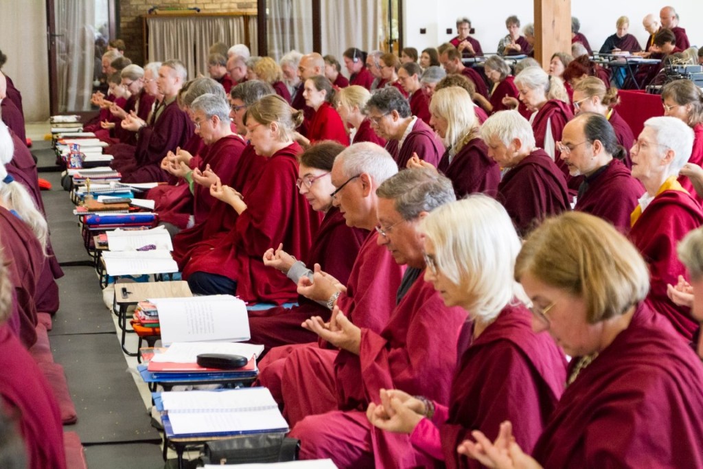 Al haber recibido tales enseñanzas y haberse dedicado a las prácticas con compañeros de la sangha, todos expresaron su inmensa gratitud a nuestro precioso guru que incansablemente logra todo beneficio para todos los seres. La asamblea concluyó el retiro haciendo vastos ofrecimientos de mandala y de cuerpo, palabra y mente.